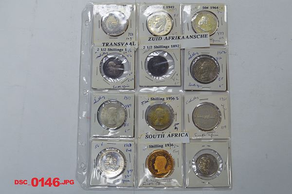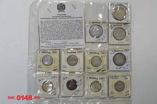 South Africa. 1892, 1893, 1895, 1896, 1897 2-1/2 Shillings; 1947, 1948, 1949, 1951, 1952, 1953, 1954, 1956, 1960, 1963, 1964 5 Shillings; Plenty of 3, 6 Pence, 1, 2, Shillings. 1962 Proof Set in case of issue, coins now spot toned. Early types often Good-Very Good, later issues are Very Fine or quite better. Just over 125 pieces.