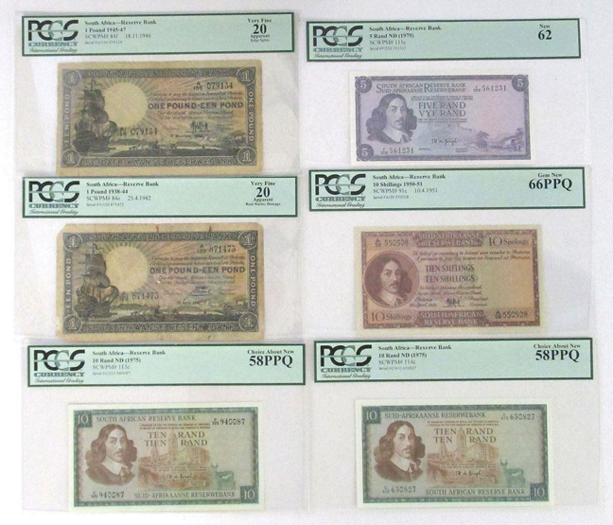 South Africa...., 1942 to ND (1975). Lot of 6 Issued Banknotes, Includes: 1942, 1 Pound, P-84e, PCGS graded Very Fine 20 Apparent with comment "Rust Stains; Damage;" 1946, 1 Pound, P--84f, PCGS graded Very Fine 20 Apparent with comment "Edge Splits;" 10 Shillings, P-91c, PCGS graded Gem New 66PPQ; 5 Rand, P-111c, PCGS graded New 62; 10 Rand, P-113c, PCGS graded Choice About New 58PPQ; 10 Rand, P-114c, PCGS graded Choice About New 58PPQ. (6). Sold "AS IS" no returns accepted.