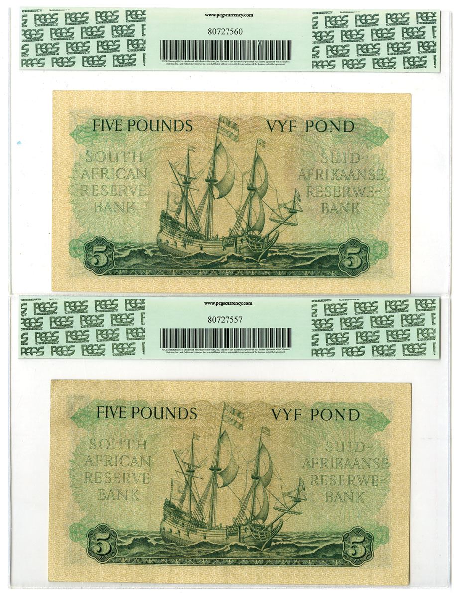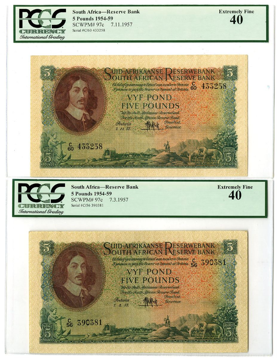 South Africa, 1957. 5 Pounds, P-97c (2), Issued Banknote Pair, Dark green on orange and m/c with portrait of Jan van Riebeeck at left and shepherd and cattle at bottom of note, Bank title at top in English and Afrikaans, Back is green with large ship at center, S/Ns C/56 390381 and C/60 433258, Both notes are PCGS graded Extremely Fine 40. Attractive banknote pair.