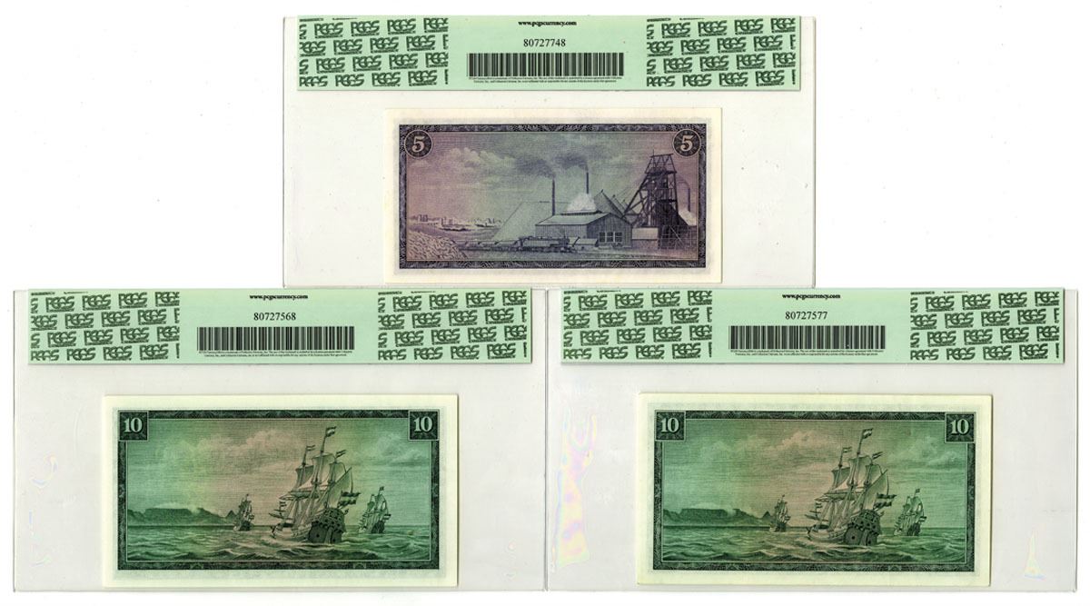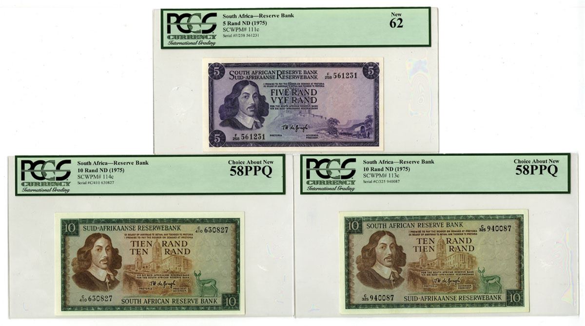 South Africa, ND (1975). Lot of 3 Issued Banknotes, Includes: 5 Rand, P-111c S/N F/258 561231, PCGS graded New 62; 10 Rand, P-113c, S/N C/325 9400087, PCGS graded Choice About New 58PPQ; 10 Rand, P-114c, S/N C/410 630827, PCGS graded Choice About New 58PPQ. (3). Sold "AS IS" no returns accepted.