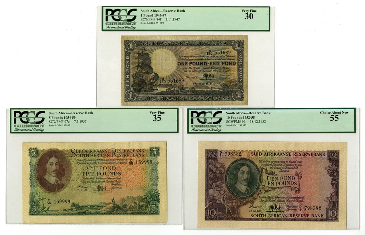South Africa..., 1947-57. Lot of 3 Issued Banknotes, Includes: 1947, 1 Pound, P-84f, PCGS graded Very Fine 30; 1957, 5 Pounds, P-97c, PCGS graded Very Fine 35; 1952, 10 Pounds, P-99, PCGS graded Choice About New 55. (3). Sold "AS IS" no returns accepted.