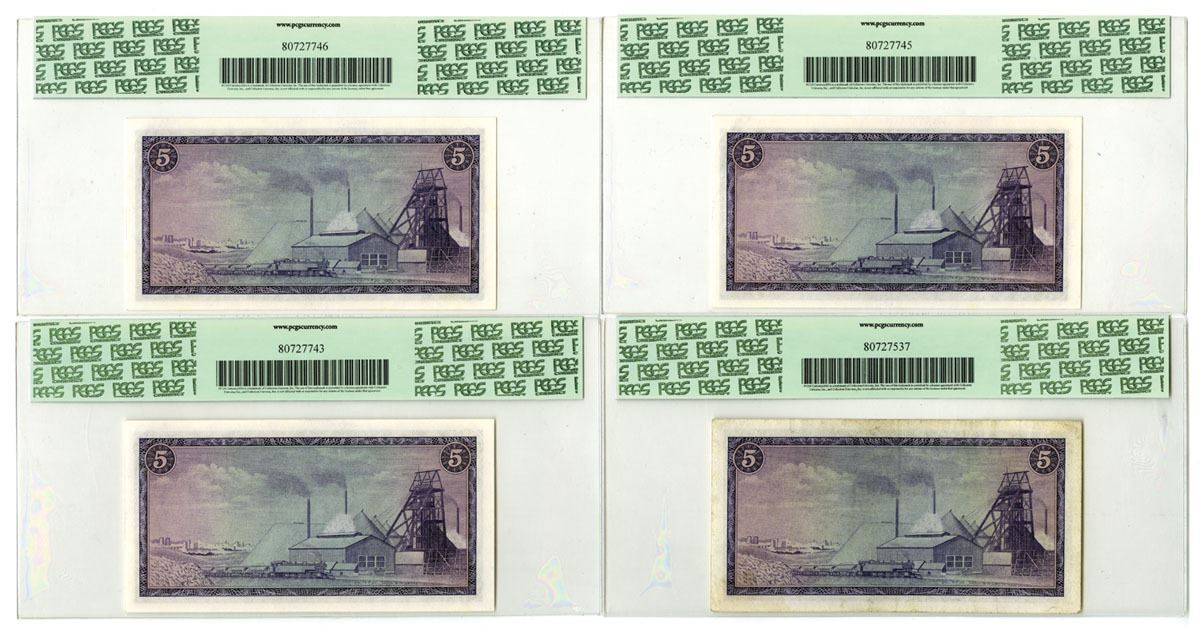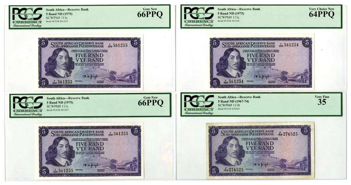 South Africa..., ND (1967-75). Lot of 4 Issued Banknotes, Includes: ND (1967-74), 5 Rand, P-111b, S/N F/154 276525, PCGS Very Fine 35; 5 Rand, P-111c (3), Sequential Banknote Trio, S/Ns F/258 561233 to F/258 561235, PCGS graded Very Choice New 64PPQ & Gem New 66PPQ. (4). Sold "AS IS" no returns accepted.
