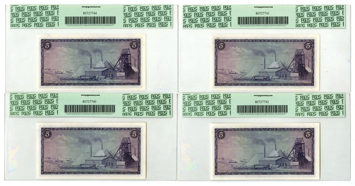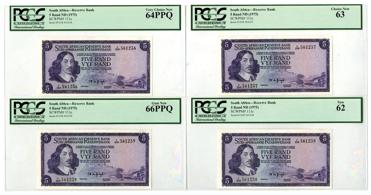 South Africa..., ND (1975). 5 Rand, P-111c (4), Sequential Issued Banknote Trio, Purple on blue underprint with portrait of Jan van Riebeeck at left, Back is purple and m/c with plant at center, S/Ns F/258 561236 to F/258 561239, All are PCGS graded: New 62, Choice New 63, Very Choice New 64PPQ, and Gem New 66PPQ. (4). Sold "AS IS" no returns accepted.