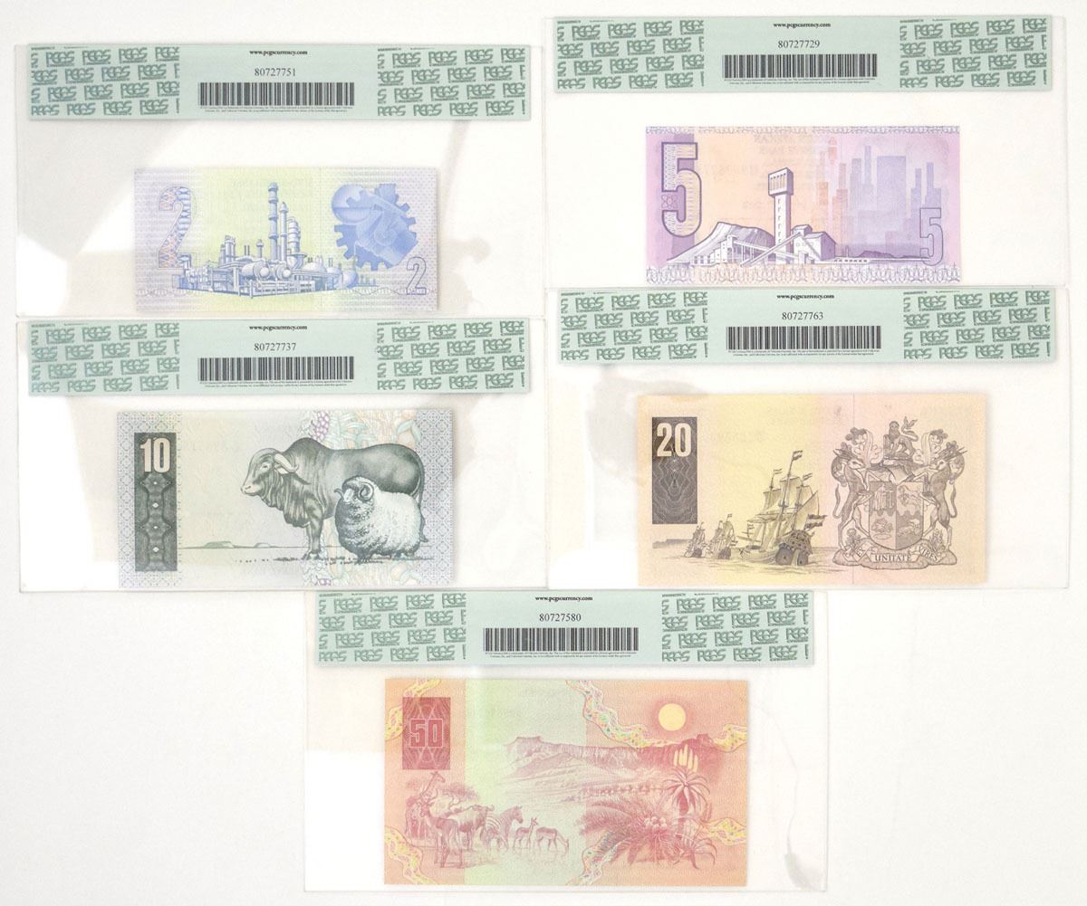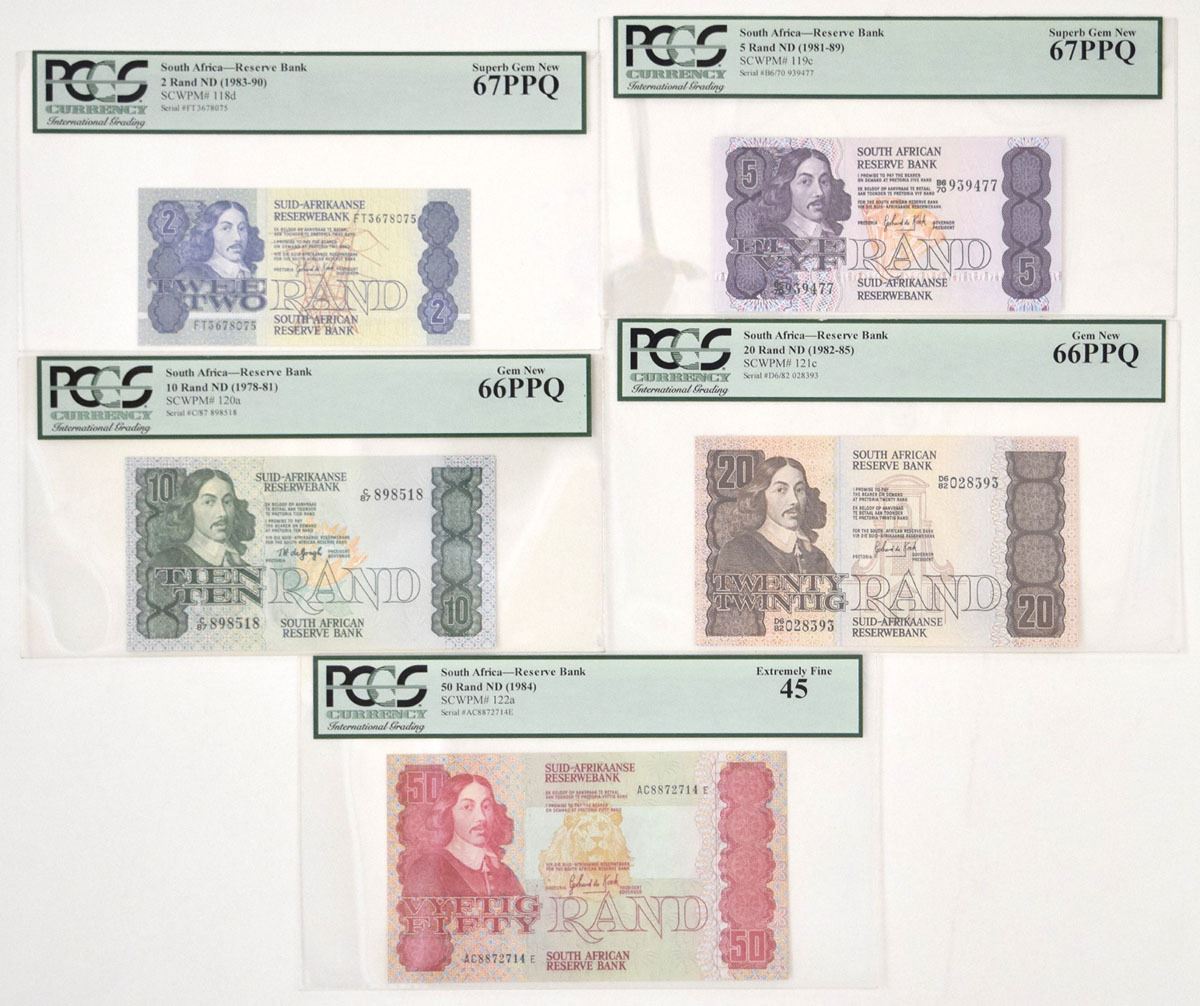 South Africa, ND (1978-90). Lot of 5 Issued Banknotes, Includes: ND (1983-90), 2 Rand, P-118d, PCGS Superb Gem New 67PPQ; ND (1981-89), 5 Rand, P-119c, PCGS Superb Gem New 67PPQ; ND (1978-81), 10 Rand, P-120a, PCGS Gem New 66PPQ; ND (1982-85), 20 Rand, P-121c, PCGS Gem New 66PPQ; ND (1984), 50 Rand, P-122a, PCGS Extremely Fine 45. (5). Sold "AS IS" no returns accepted.