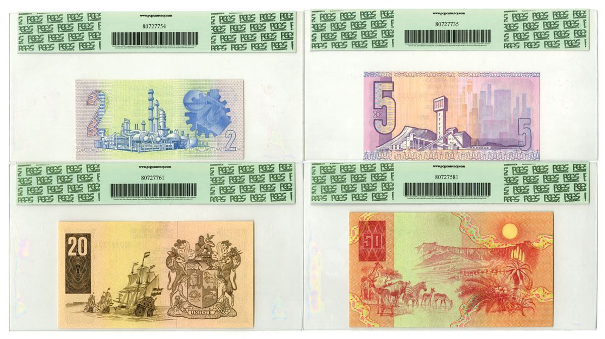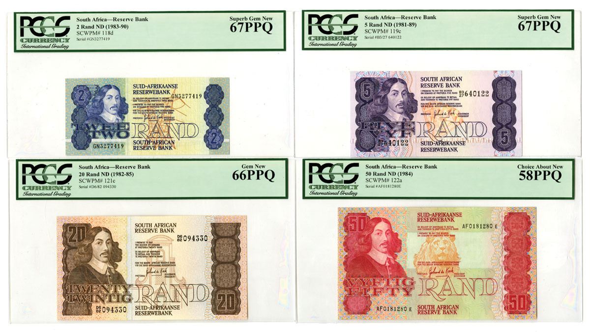South Africa..., ND (1981-90). Lot of 4 Issued Banknotes, Includes: ND (1983-90), 2 Rand, P-118d, PCGS Superb Gem New 67PPQ; ND (1981-89), 5 Rand, P-119c, PCGS Superb Gem New 67PPQ; ND (1982-85), 20 Rand, P-121c, PCGS Gem New 66PPQ; ND (1984), 50 Rand, P-122a, PCGS graded Choice About New 58PPQ. (4). Sold "AS IS" no returns accepted.