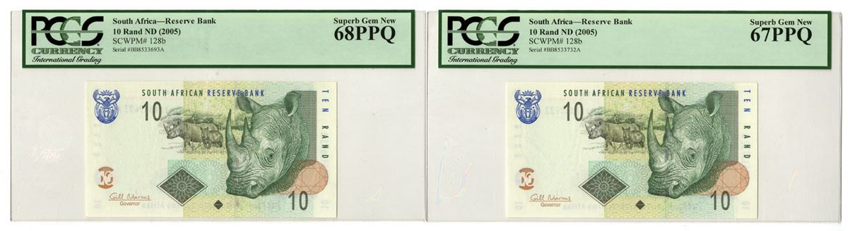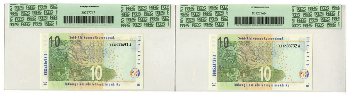 South Africa, ND (2005). 10 Rand, P-128b (2), Issued Banknote Pair, Black with green and m/c printing with rhino at right, Back is m/c with grazing sheep at center, S/Ns BB8533693A & BB8533732A, Notes are PCGS graded Superb Gem New 67PPQ and Superb Gem New 68PPQ. (2). Sold "AS IS" no returns accepted.