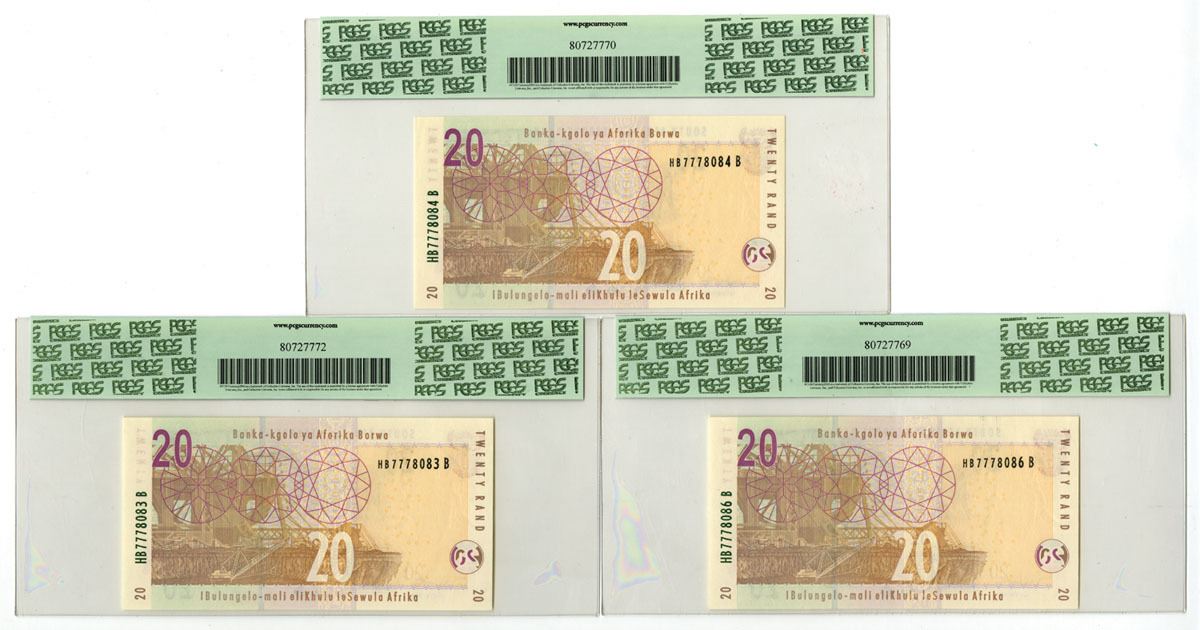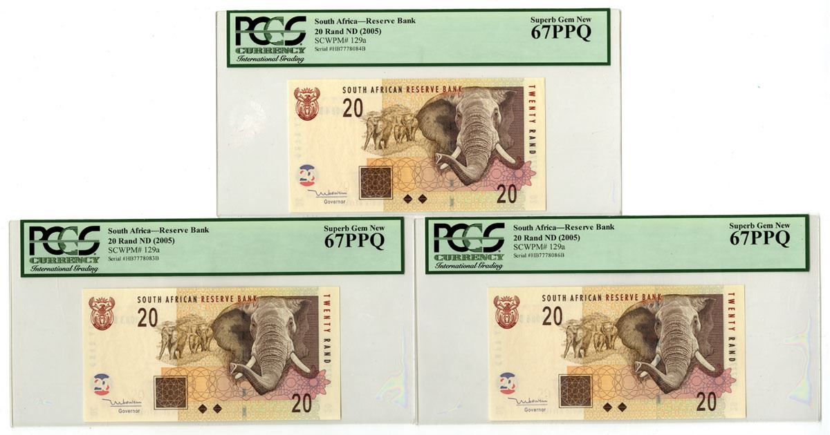 South Africa, ND (2005). 20 Rand, P-129a (3), Issued Banknote Trio, Black with brown and m/c printing with elephant at right, Back is m/c with mining operation at center, S/Ns HB7778083B, HB7778084B, & HB7778086B, Notes are all PCGS graded Superb Gem New 67PPQ. (3). Sold "AS IS" no returns accepted.