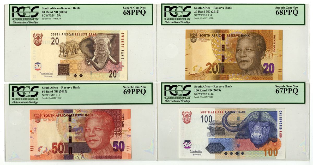 South Africa, ND (2005-12). Lot of 4 Issued Banknotes, Includes: ND (2005), 20 Rand, P-129a, PCGS graded Superb Gem New 68 PPQ; ND (2005), 100 Rand, P-131a, PCGS graded Superb Gem New 67 PPQ; ND (2012), 20 Rand, P-124, PCGS graded Superb Gem New 68 PPQ; ND (2012), 50 Rand, P-135, PCGS graded Superb Gem New 69 PPQ. (4). Sold "AS IS" no returns accepted.