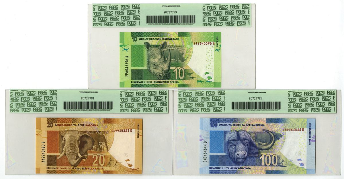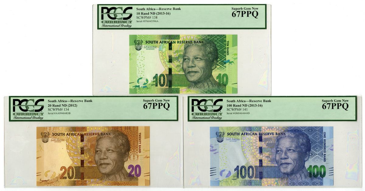 South Africa, ND (2012-16). Lot of 3 Issued Banknotes, Includes: ND (2012), 20 Rand, P-134, Brown on m/c, S/N AA9940483B; ND (2013-16), 10 Rand, P-138, Green on m/c, S/N FP6045596A; ND (2013-16), 100 Rand, P-141, Blue on m/c, S/N GM0464644D. Notes all have portraits of Nelson Mandela at right and are all PCGS graded Superb Gem New 67PPQ. (3). Sold "AS IS" no returns accepted.