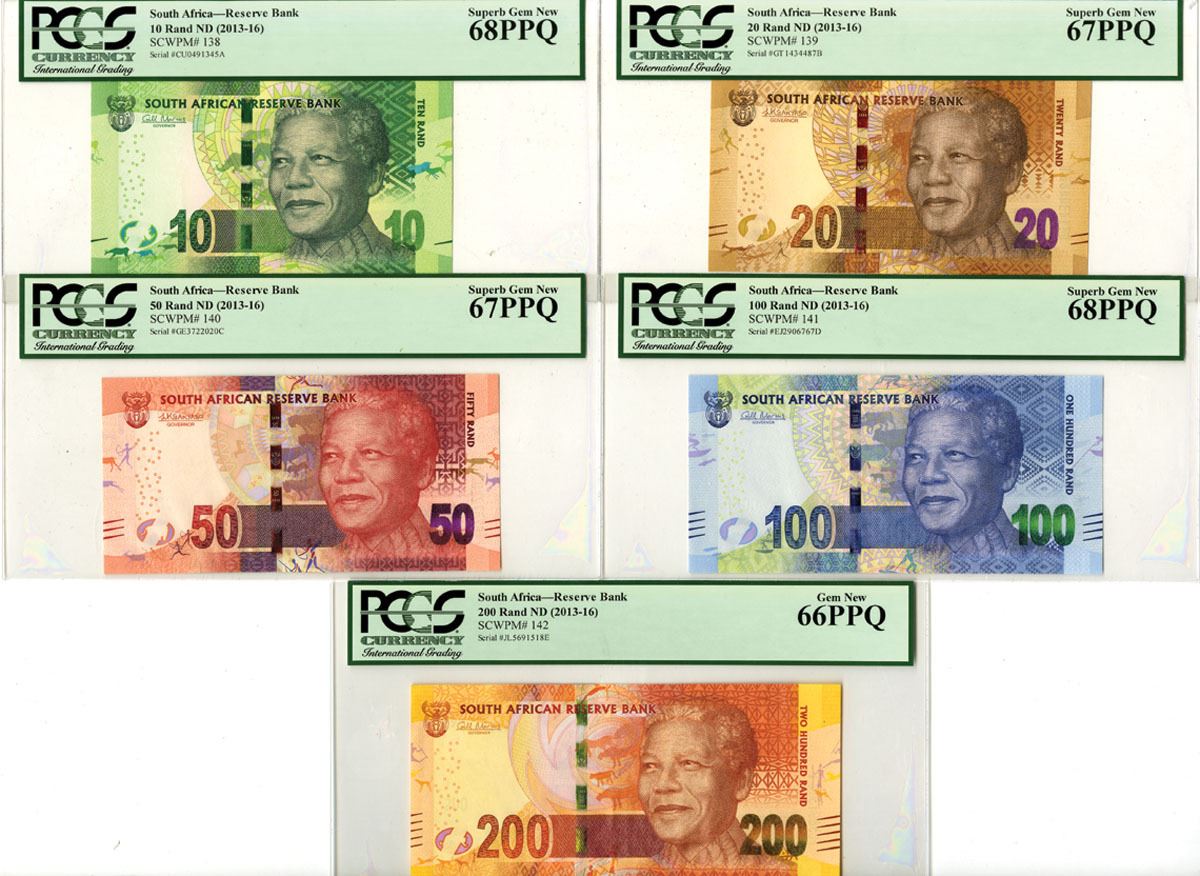 South Africa, ND (2013-16). Lot of 5 Issued Banknotes, Includes: 10 Rand, P-138, PCGS graded Superb Gem New 68 PPQ; 20 Rand, P-139, PCGS graded Superb Gem New 67 PPQ; 50 Rand, P-140, PCGS graded Superb Gem New 67 PPQ; 100 Rand, P-141, PCGS graded Superb Gem New 68 PPQ; 200 Rand, P-142, PCGS graded Gem New 66 PPQ. Notes are in different colors and all have Nelson Mandela on obverse at right and different African animals on reverse. (5). Sold "AS IS" no returns accepted.