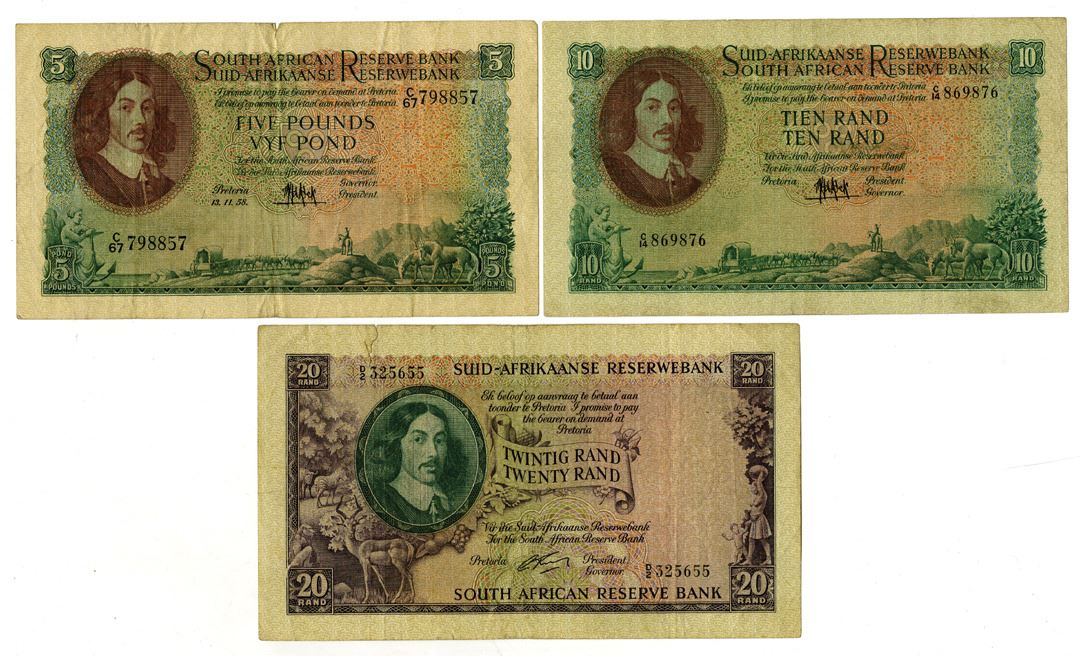 South Africa....., 1958 and ND (1962-65). Lot of 3 Issued Banknotes: 5 Rand, P-96c, 1959; 10 Rand, P-107a, 1961; 20 Rand, P-108A, ND (1962-65). Notes vary from Fine to VF condition, the 20 Rand with a small 1/2 inch tear in the top margin just touching design. (3). Sold "AS IS" no returns accepted.