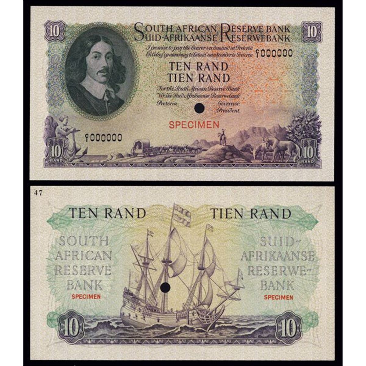 Pretoria, South Africa, ND (1961-65), 10 Rand, P-106ct Unlisted Color Trial Specimen, Purple on m/c instead of issued green on m/c, Portrait of Jan van Riebeeck at left, Specimen overprints, POC's, No signature, S/N C/1 000000, Choice to Gem Uncirculated, Rare note as trial color.