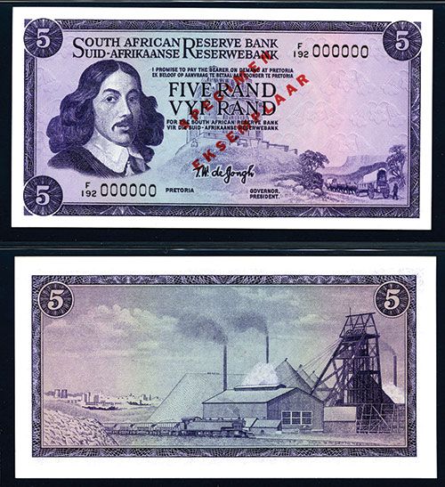 Pretoria, South Africa, ND (1967-74), 5 Rands, P-111s2, Specimen, Springbok Watermark, S/N F/192 000000, Specimen overprints, PMG graded Superb Gem Uncirculated 67 EPQ, Rare as specimen and Finest Known as well as only one graded by PMG.