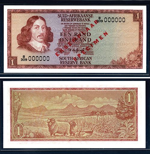 Pretoria, South Africa, ND (1973-75), 1 Rand, P-116as, Unlisted Specimen, Springbok Watermark, S/N B/309 000000, Specimen overprints, PMG graded Superb Gem Uncirculated 67 EPQ, Rare as specimen and Finest Known as well as only one graded by PMG.
