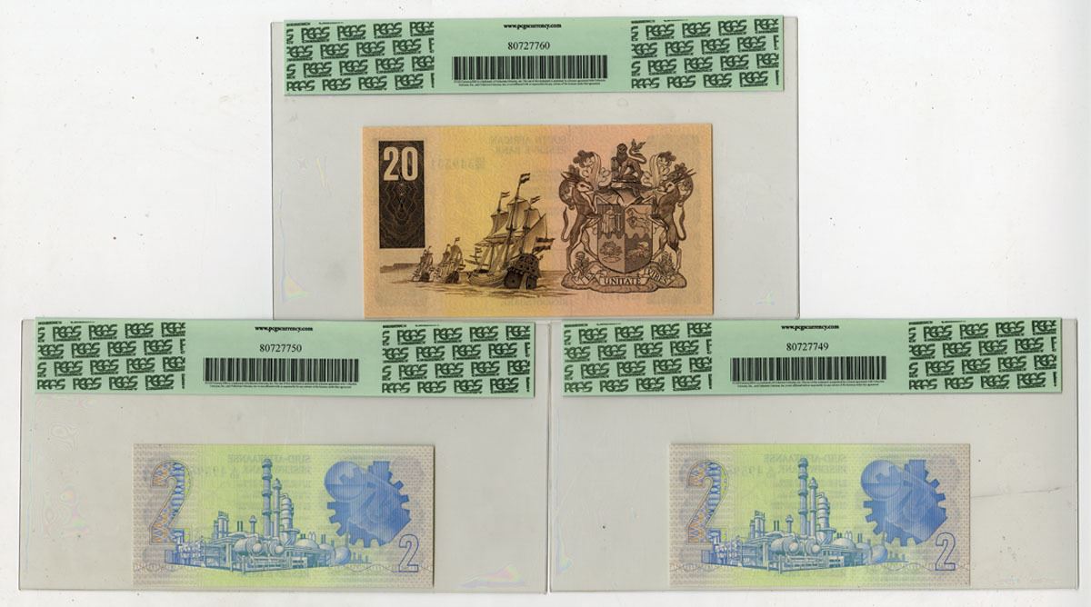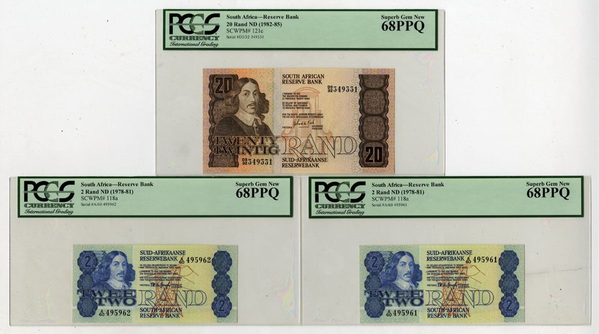 South Africa, -ND (1982-85). Lot of 3 Issued Banknotes, all 3 are PCGS graded Superb Gem New 68 PPQ. Includes Sequential pair of 2 Rand, P-118a (2), S/N A/60 495961 & A/60 495962, there is only 1 note in the PMG census at this level out of 19 graded; and, 20 Rand, P-121c, S/N D3/32 349331, there is only 1 note in the PMG census at this level out of 51 graded. (3). Sold "AS IS" no returns accepted.