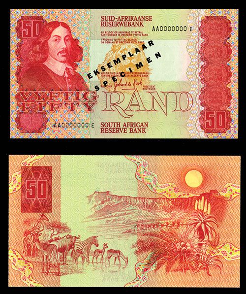 Pretoria, South Africa, ND (1984-90), 50 Rand, P-122d, Unlisted Specimen, Red on m/c, Portrait of Jan van Riebeeck at left, Black Specimen overprints, Signature of G.P.C. de Kock, Black S/N AA 0000000 E, Gem Uncirculated condition, Rare as specimen.