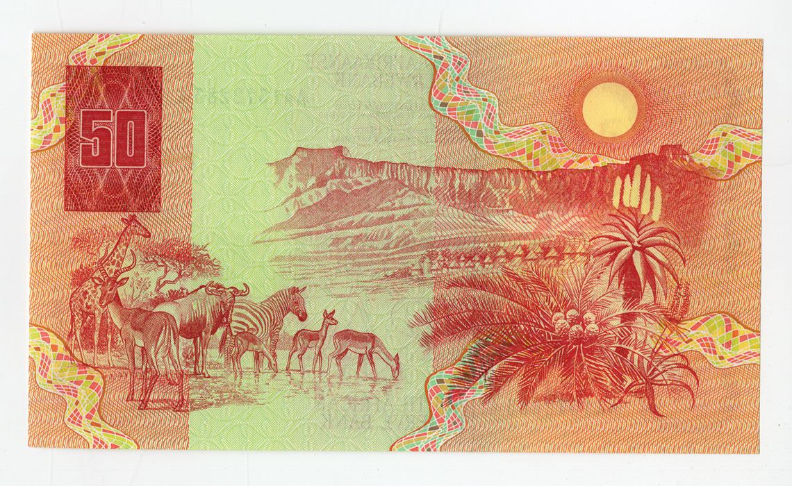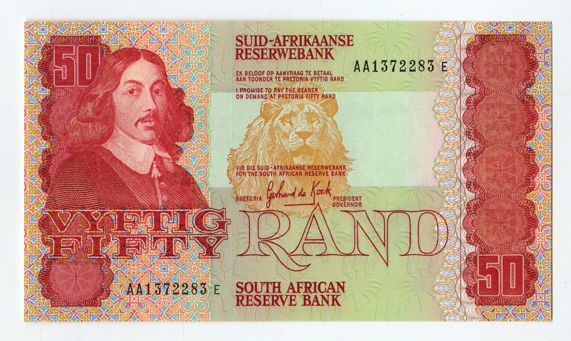 South Africa, ND (1984). 50 Rand, P-122a, Issued Banknote, Red on m/c underprint with Jan van Riebeek at left and lion at center, Back is red on m/c with animals at watering hole, S/N AA1372283E, Choice AU to Uncirculated condition.