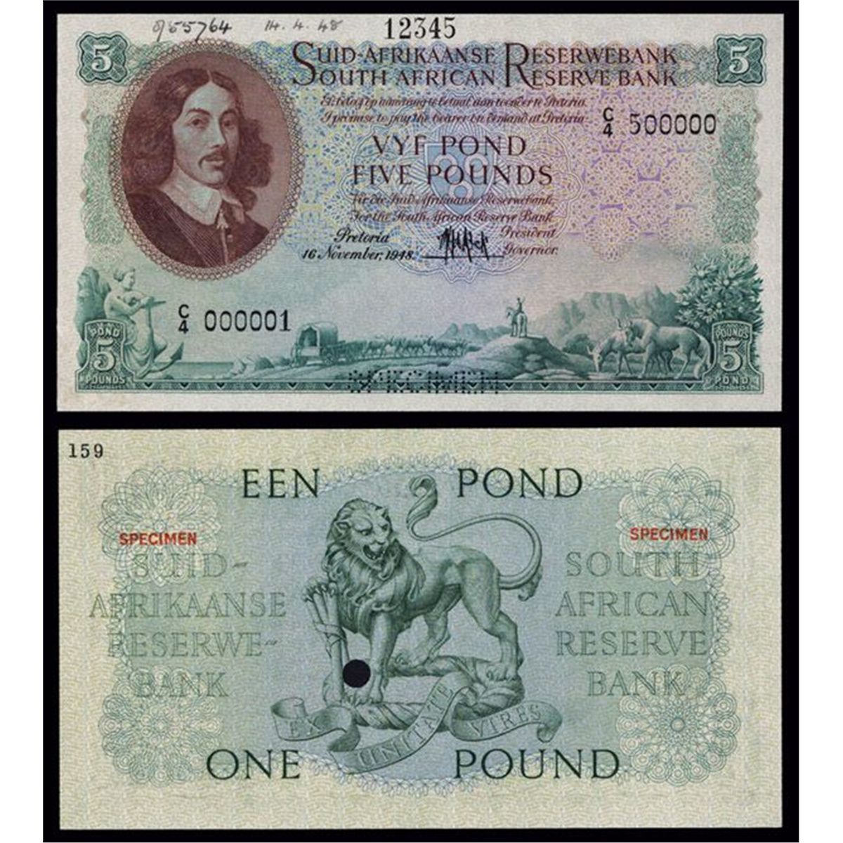 Pretoria, South Africa, 16th November 1948, 5 Pounds, P-95s Unlisted Specimen, green on m/c, Portrait of Jan van Riebeeck at left, ships on lower right, Pin-punch Specimen overprints, POC's, Signature of M.H. de Kock, S/N C/4 000001 - C/4 500000, 12345 printed on top middle margin plus additional handwritten numbers and date, Choice AU to Uncirculated condition with mounting remnants on back right margin, Rare as specimen.