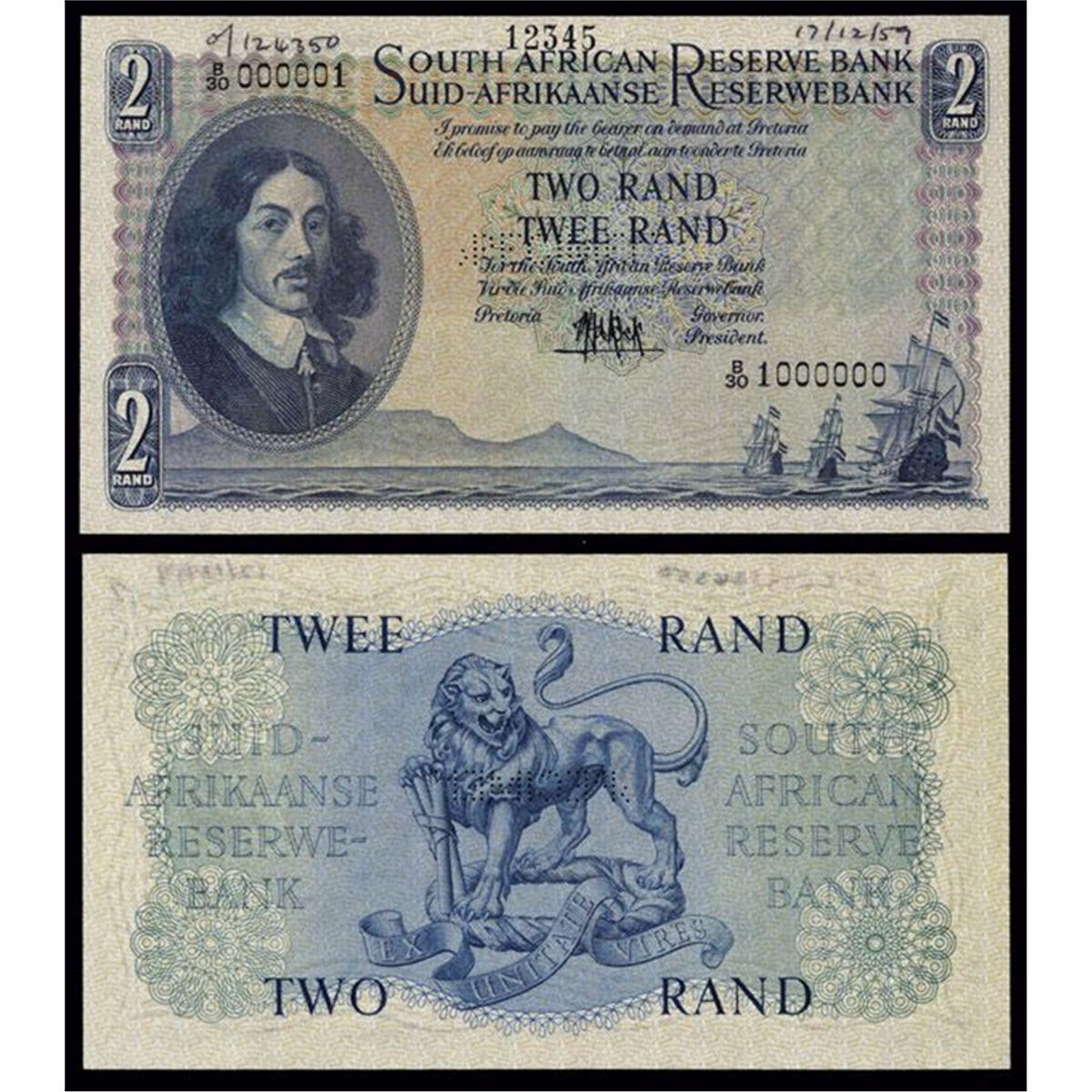 Pretoria, South Africa, ND (1959), 2 Rand, P-104as Unlisted Specimen, blue on m/c, Portrait of Jan van Riebeeck at left, ships on lower right, Pin-punch Specimen overprints, POC's, Signature of M.H. de Kock, S/N B/30 000001 - B/30 1000000, 12345 printed on top middle margin plus additional handwritten numbers and date, Uncirculated condition with mounting remnants on back right margin, Rare as specimen.
