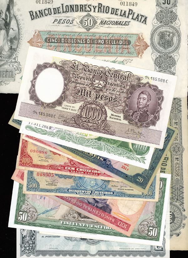 Uruguay, 2 Issued Banknotes, Includes: 50 Pesos = 5 Doblones, P-S238a, Green and brown print with Liberty standing with sword shield and flag at left and British shield at right, S/N 011849; 100 Pesos, P-S245a, Black on yellow/green underprint, Portrait of Christopher Columbus at left and boy running with rope at right, S/N 63386; and, Banco Central Brasil 5 Centavos on 50 Cruzeiros, P-184a, ND (1966-67), TDLR; 100 Cruzeiros, P-198b, ND (1984), CdM-B; 500 Cruzados, P-212c, ND (1987), CdM-B; 1 Cruzado Novo on 1000 Cruzados, P-216b, ND (1989), CdM-B; Banco Central de Chile 10 Centesimos on 100 Pesos, P-127a, ND (1961) with Official Envelope, Cdm-Chile; Repblica de Colombia 20 Centavos, P-Unlisted, Back Proof, 1891-92; 100 Colones, P-254a (2), 1989-90, ABNC; Banco Espanol de la Habana 5 Centavos, P-29d, 1883, NBNC; Banco Espanol de la Isla de Cuba 5 Centavos, P-45a, 1896, ABNC; Banco Nacional de Cuba 100 Pesos, P-93a, 1959, ABNC; El Estado de Chihuahua 1 Peso, P-S529f, 1914; Banco de Mexico 2000 Pesos, P-86c (3), 1989, BdM; 5000 Pesos, P-88c, 1989, BdM; 20,000 Pesos, P-92b, 1989, BdM; National Reserve Bank of Peru, 10 Soles de Oro, P-88, 1965, ABNC; Banco Central de la Repblica Argentina 1000 Pesos, P-269b, L.1935 (1944-55); 500 Pesos, P-292, ND (1972-73), CdM; Repblica dos Estados Unidos do Brasil 20 Mil Reis, P-48c, 1931, ABNC; 10 Centavos on 100 Cruzeiros, P-185 (2), ND (1966-67), TDLR; 50 Centavos on 500 Cruzeiros, P-186a, ND (1967), ABNC; Banco Central do Brasil, P-198b, ND (1984), CdM-B; Banco Central de Chile 50 Escudos, P-140b, ND (1960s), CdM-Chile; Ecuador Banco sur Americano 100 Sucres, P-S254, 1920; Banco de La Repblica 1 Peso Oro, P-404b, 1964, IBB. Condition ranges from Fine to CU condition. (30 notes). (photo on web site)