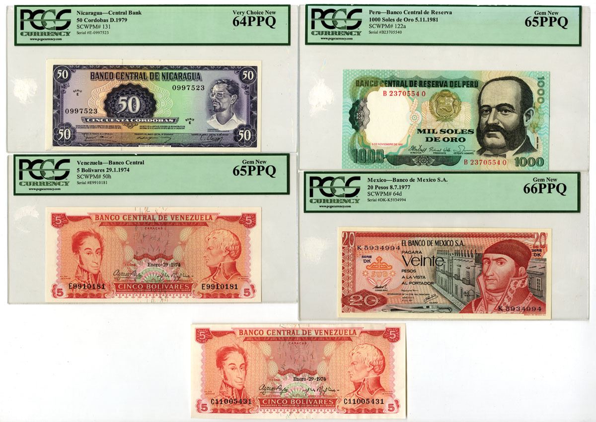South America, 1974-81. Lot of 5 Issued Banknotes, Includes: 1977, Banco de Mexico, 20 Pesos, P-64d, PCGS Gem New 66PPQ; D.1979, Central Bank of Nicaragua, 50 Cordobas, P-131, PCGS Very Choice New 64PPQ; 1981, Banco Central de Reserve del Peru, 1000 Soles, P-122a, PCGS Gem New 65PPQ; 1974, Banco Central de Venezuela, P-50h (2), 1 is PCGS graded Gem New 65PPQ other is AU to UNC condition. (5). Sold "AS IS" no returns accepted.