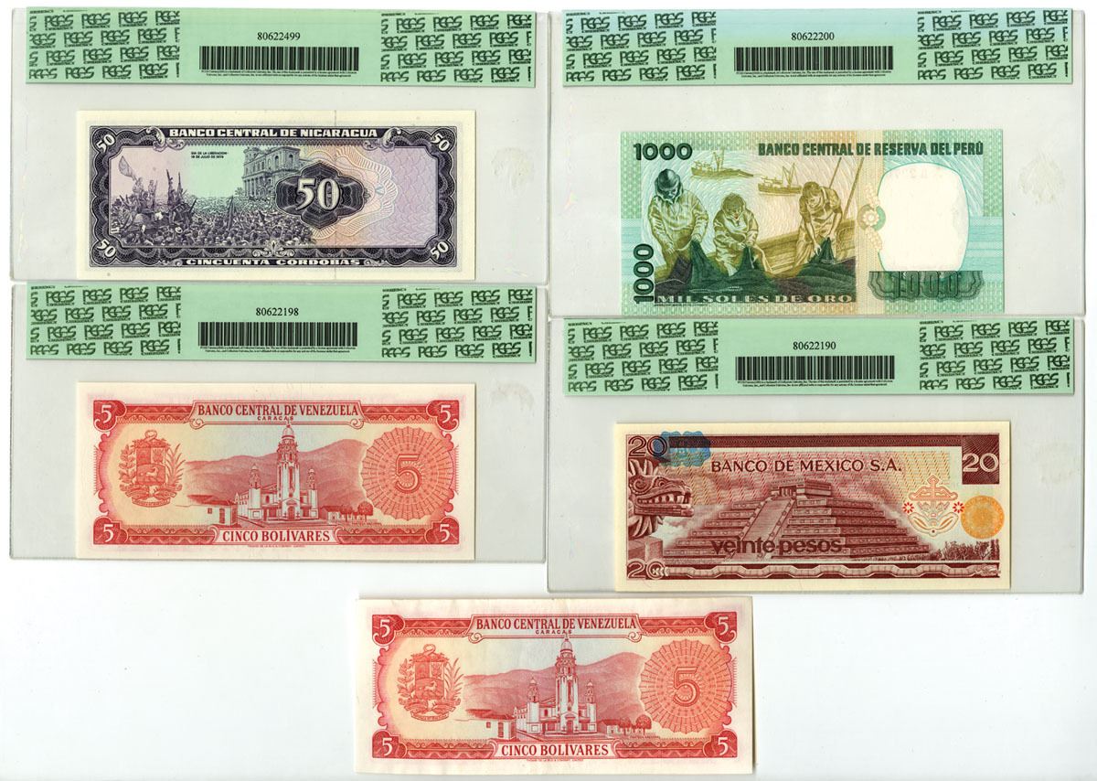 South America, 1974-81. Lot of 5 Issued Banknotes, Includes: 1977, Banco de Mexico, 20 Pesos, P-64d, PCGS Gem New 66PPQ; D.1979, Central Bank of Nicaragua, 50 Cordobas, P-131, PCGS Very Choice New 64PPQ; 1981, Banco Central de Reserve del Peru, 1000 Soles, P-122a, PCGS Gem New 65PPQ; 1974, Banco Central de Venezuela, P-50h (2), 1 is PCGS graded Gem New 65PPQ other is AU to UNC condition. (5). Sold "AS IS" no returns accepted.