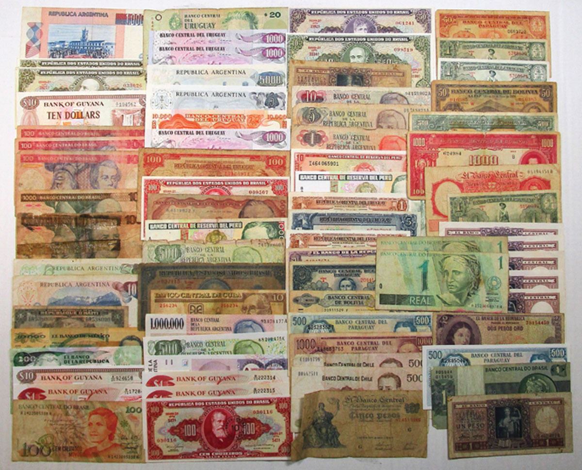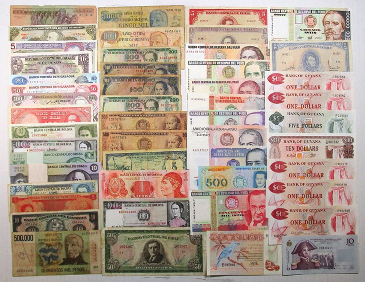 Various South American and Caribbean countries, Lot of 120+ Banknotes from South American Countries, Including: Brazil, Guyana, Mexico, Haiti, Argentina, Peru, Uruguay, Paraguay, Bolivia, Venezuela, Nicaragua and more. Notes range from Fine to CU condition. (120+). Sold "AS IS" no returns accepted.