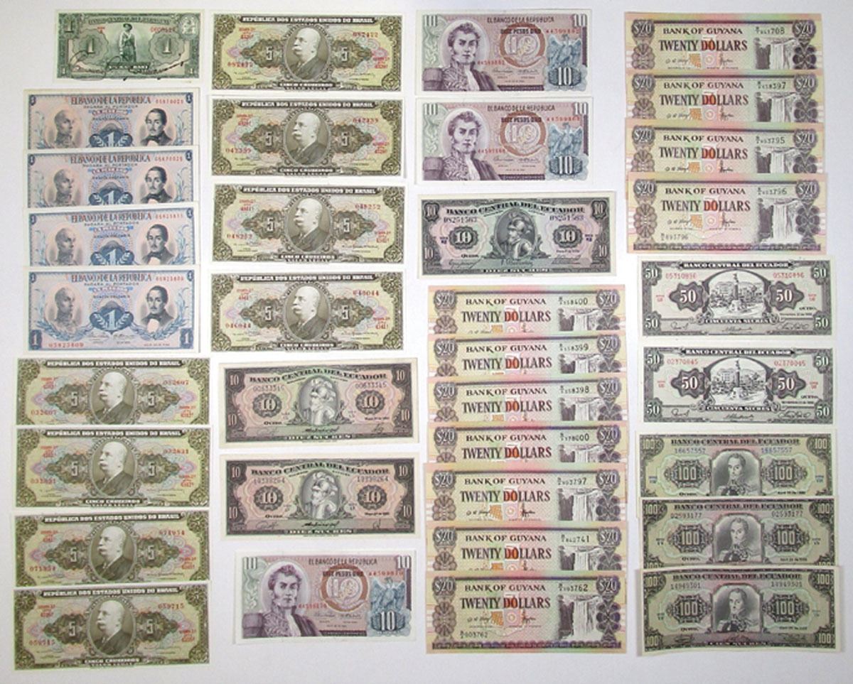 Colombia, Ecuador, Paraguay and Brazil, 1952 to 1988. Lot of 32 Issued Banknotes, Includes: ND (1964), Republic of the United States of Brazil 5 Cruzeiros, P-176d (8), TDLR; 1966, Bank of the Republic of Colombia 1 Peso Oro, P-404c (4), IdB; 1965, 10 Pesos Oro, P-407c; 1974, Banco Central del Ecuador 10 Sucres, P-101Ab, ABNC; 1980 10 Sucres, P-114b (2), TDLR; 1988 50 Sucres, P-122a (2), TDLR; 1986 & 1990 100 Sucres, P-123 (3), TDLR;1996, Bank of Guyana 20 Dollars, P-30b1 (10), TDLR; L. 1952 Banco Central del Paraguay 1 Guarani, P-185a, TDLR. Notes range from VF to UNC condition with most in the AU to Cu condition range. (32). Sold "AS IS" no returns accepted.