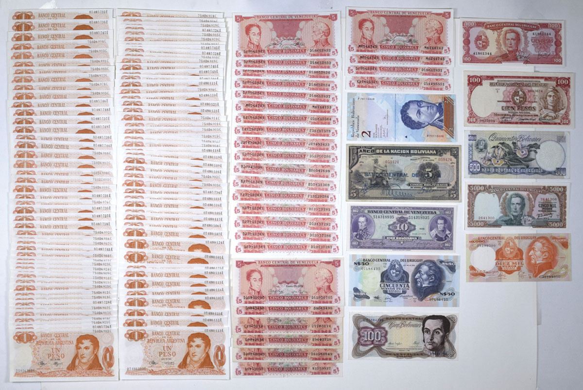 Venezuela, Argentina & Other South America, ND (1929)-2007. Lot of over 130 Issued Banknotes, mostly Uncirculated to CU condition with many sequential notes, Includes: Banco Central de la Republica Argentina, ND (1970-73), 1 Peso, P-287 (95). CMN; Banco Central de Bolivia, ND (1929), 5 Bolivianos, P-113, ABNC; Banco Central del Uruguay, L.1939 (1967), 100 Pesos, P-43a, TDLR; ND (1967), 100 Pesos, P-47a, TDLR; ND (1967), 5000 Pesos, P-50b, TDLR; ND (1967), 10,000 Pesos, P-51c, TDLR; ND (1988-89), 50 Nuevo Pesos, P-61A, TDLR; Banco Central de Venezuela, 1974, 5 Bolivares, P-50h (5), TDLR; 1976, 10 Bolivares, P-51e, ABNC; 1987, 100 Bolivares, P-66a, BDDK; 1981, 500 Bolivares, P-67a, BDDK; 1989, 5 Bolivares, P-70a (2) & P-70b (19), TDLR; 2007, 2 Bolivares, P-88a, CMV. Notes range from Fine to AU condition.