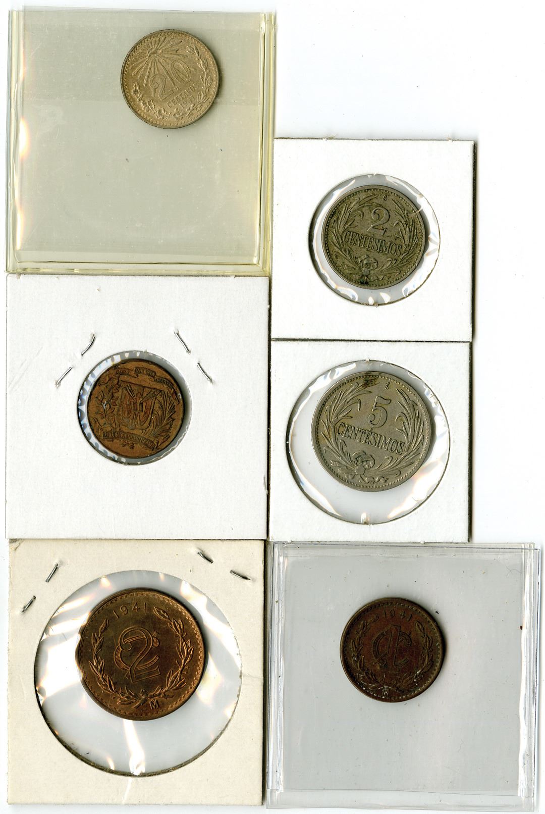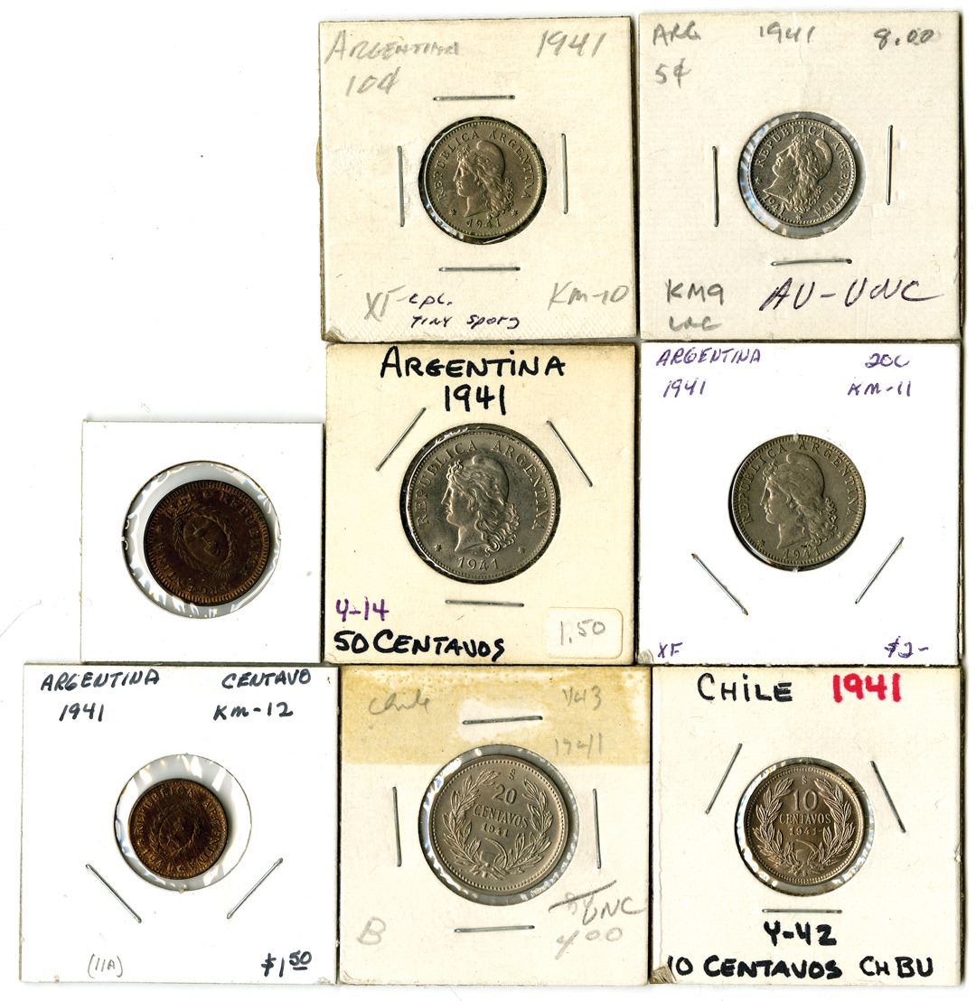 U.S. and South America Assortment of coins, al held within a protective binder and organized by country. All from 1941. Argentina: 6; Chile: 2; Colombia: 8; Costa Rica: 2; Peru: 13; Dominican Republic: 1; Mexico: 3; Uruguay: 2; and United States of America: 11; and 1 Magic Coin with Liberty on one side, and Abraham Lincoln penny on the other. (49 total)