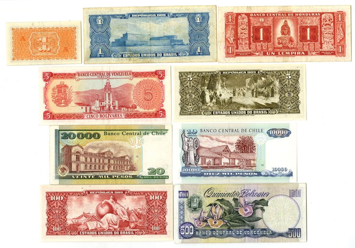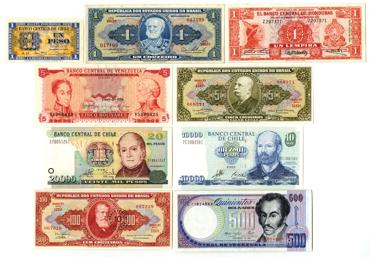 South America, 1943-2003. Lot of 9 Issued Banknotes, Includes: Republic of Brazil Tesouro Nacional, ND (1954-58), 1 Cruzeiro, P-150a, ABNC; ND (1964), 5 Cruzeiros, P-176d, TDLR; ND (1966-67), 10 Centavos on 100 Cruzeiros, P-185b; Banco Central de Chile, 1943, 1 Peso = 1/10 Condor, P-90a; 2003, 10,000 Pesos, P-157b, TDLR; 1998, 20,000 Pesos, P-159a, CdM-C; Banco Central de Honduras, 1965, 1 Lempira, P-54Ab, TDLR; Banco Central de Venezuela, 1974, 5 Bolivares, P-50h, TDLR; 1987, 500 Bolivares, P-67b, BDDK. Notes range from Fine to Gem UNC condition. (
