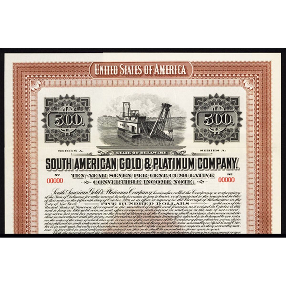 1916, $500, 7% Income Note Bond Specimen, River dredging barge on top, black on brown, POC's, VF-XF, ABNC. Rare and very attractive mining bond. 4 found in archive.