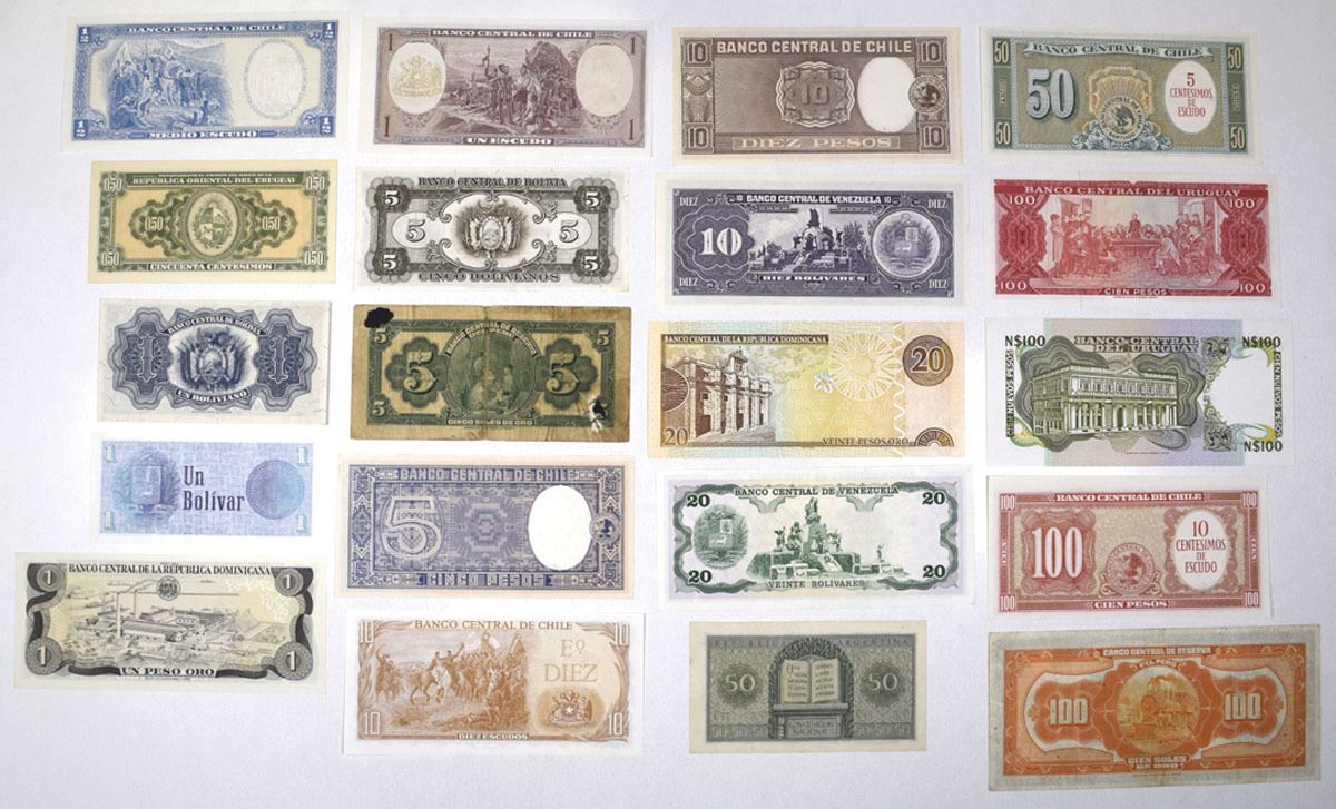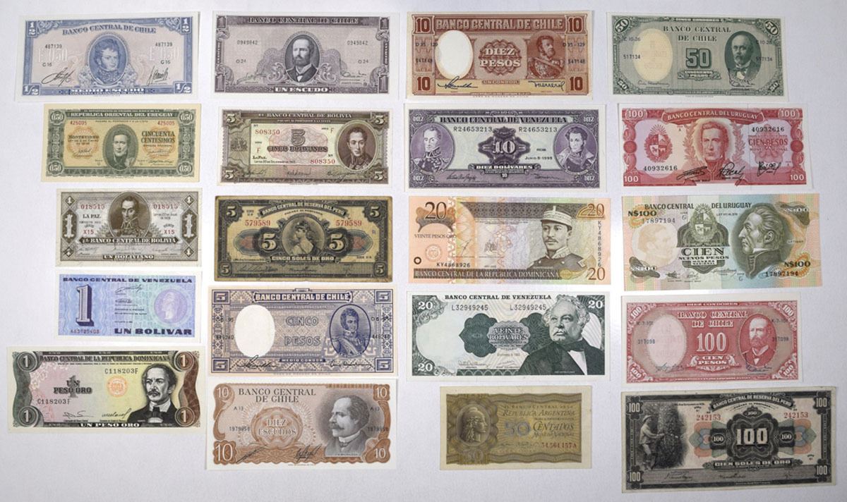 South America, 1939 to 2003. Lot of 20 Issued Banknotes from Various South American Countries, Includes: Central Bank of Argentina, L.1947 (1951), 50 Centavos, P-259b; Banco Central de Bolivia, L.1928 (1952), 1 Boliviano, P-128c; L.1945, 5 Bolivianos, P-138, TDLR; Banco Central de Chile, ND (1958-59), 5 Pesos = 1/2 Condor, P-119, CdM; ND (1958-59), 10 Pesos = 1 Condor, P-120, CdM; ND (1960-61), 5 Centesimos on 50 Pesos, P-126, CdM; ND (1960-61), 10 Centesimos on 100 Pesos, P-127a, CdM; ND (1932-75), 1/2 Escudo, P-134Aa, CdM; ND (1932-75), 1 Escudo, P-135A, CdM; ND (1970), 10 Escudos, P-142, CdM; Central Bank of the Dominican Republic, 1984, 1 Peso Oro, P-126a, TDLR; 2003, 20 Pesos Oro, P-169c, TDLR; Banco Central de Reserve del Peru, 1939, 5 Soles, P-66a, ABNC; 1939, 100 Soles, P-69a, ABNC; Banco Oriental del Uruguay, L.1939, 50 Centesimos, P-34, CdM; Banco Central del Uruguay, ND (1967), 50 Pesos, P-46a, TDLR; ND (1989), 50 Nuevos Pesos, P-61A, TDLR; Banco Central de Venezuela, 1995, 10 Bolivares, P-61d, ABNC; 20 Bolivares, P-63d, TDLR; 1989, 1 Bolivar, P-68, BDDK. Notes range from Fine to Gem UNC condition. (20). Sold "AS IS" no returns accepted.