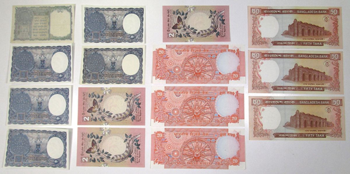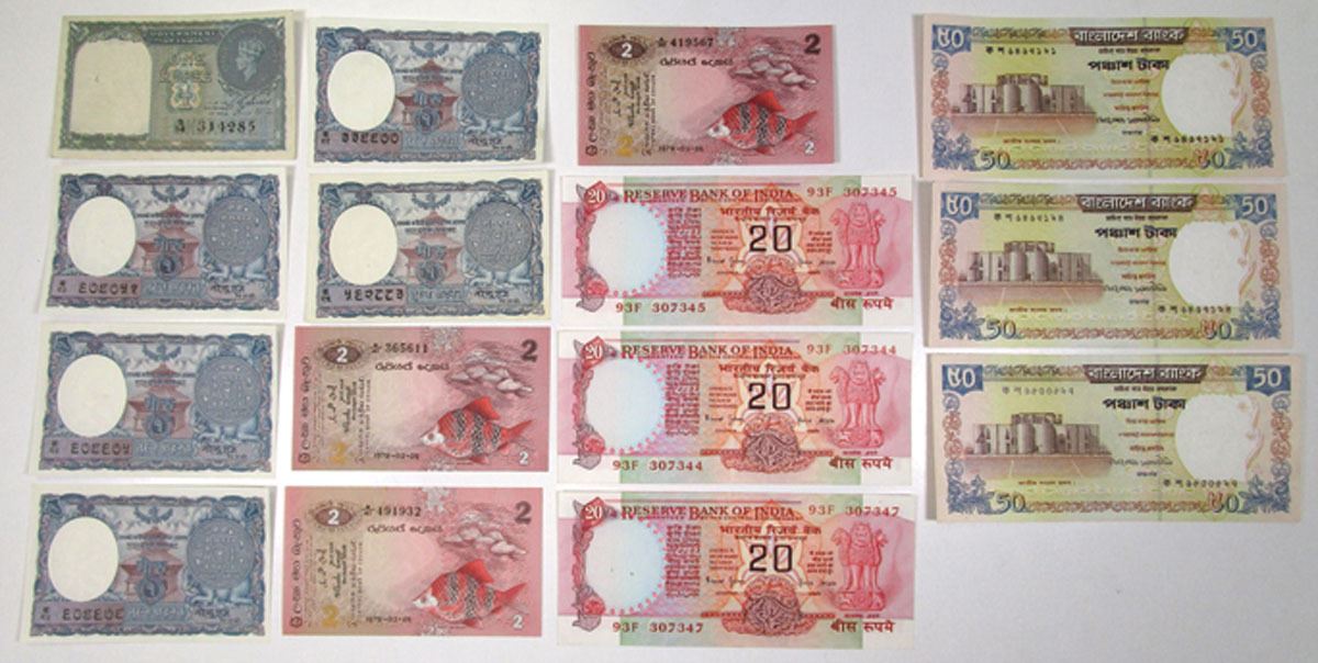 South Asia, 1940 to 2000. Lot of 15 Issued Banknotes, Includes: ND (2000) Bangladesh Bank, 50 Taka, P-36 (3); 1940, Government of India 1 Rupee, P-25a; 1997, Reserve Bank of India 20 Rupees, P-82k (3); ND (1951) Government of Nepal 1 Mohru, P-1b (5); 1979, Central Bank of Ceylon 2 Rupees, P-83 (3). Notes range from VF to Uncirculated condition. (15). Sold "AS IS" no returns accepted.