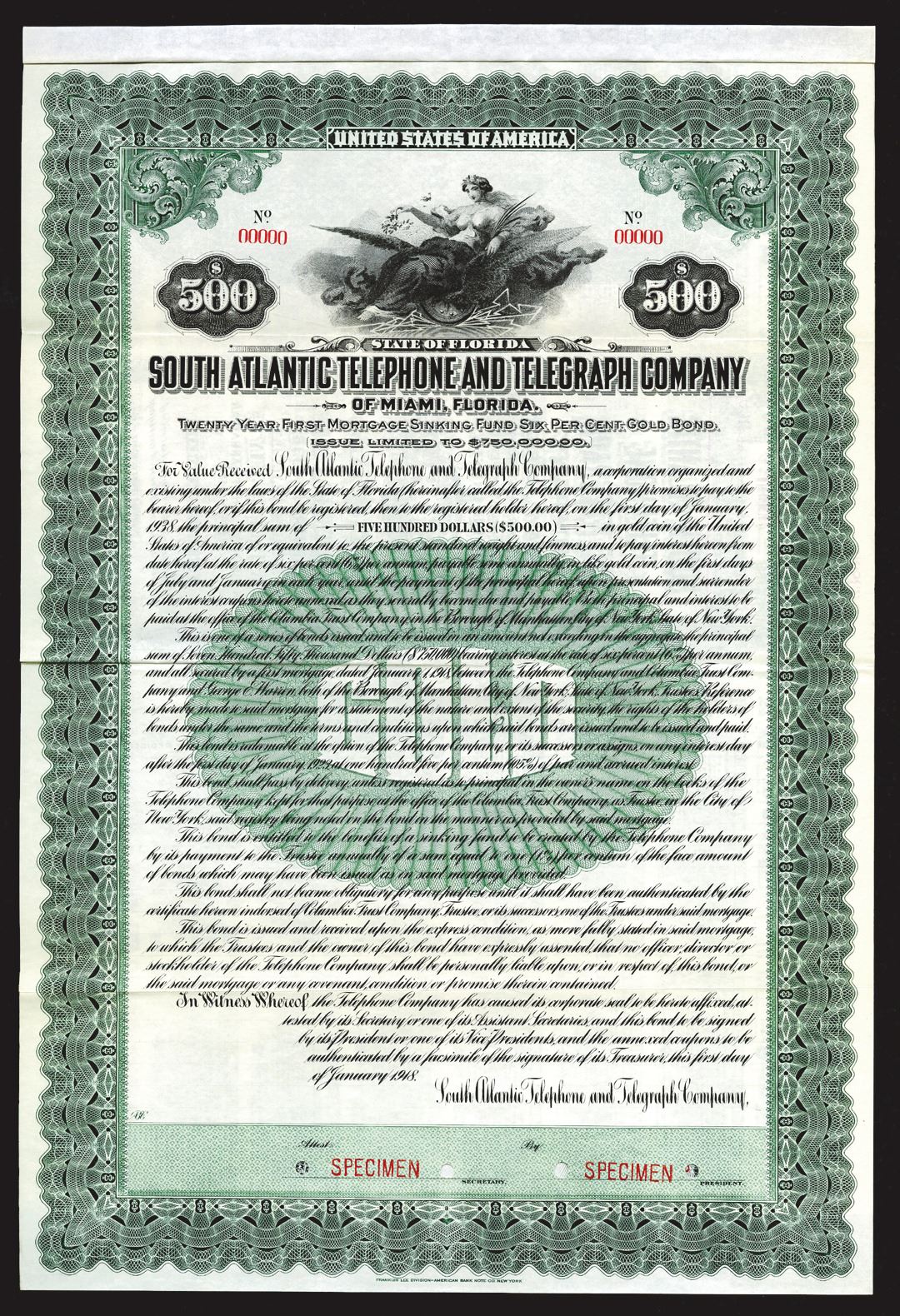 Miami, Florida. $500 Gold Coupon Bond Specimen. Black on green border, Seated topless allegorical woman on winged railroad wheel, Specimen overprints, POC's, FL ABNC. Extremely Fine.