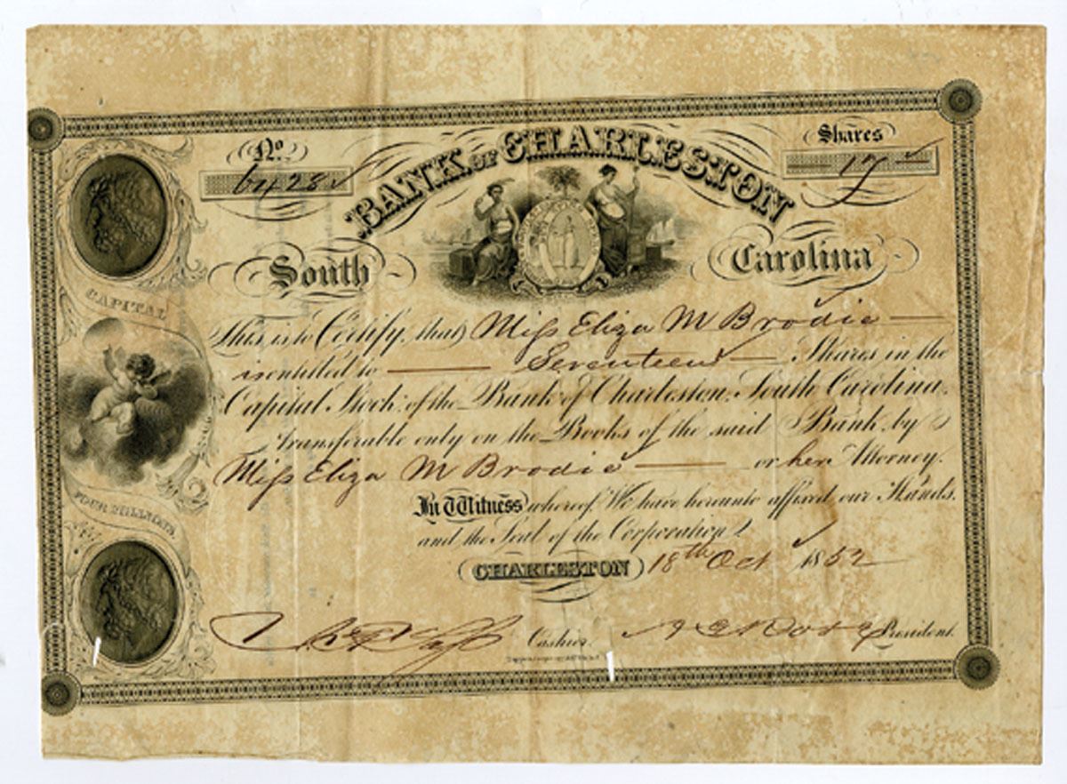 Charleston, South Carolina, 1852. 17 Shares Capital Stock I/C Certificate, Black printing with reliefs at left side and State Seal of South Carolina at top center, S/N 6428, Cut cancelled at center, Fine condition, TCC.