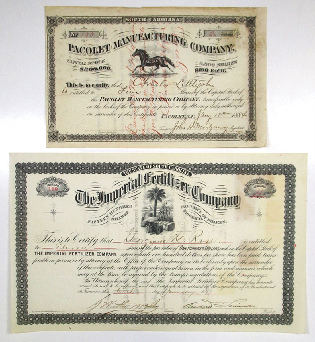 South Carolina... Lot of 2 certificates, Includes 1) Pacolet Manufacturing Co., 1884, 5 Shares Issued and Cancelled Capital Stock Certificate, Black print on simple black border on small sized certificate, Company logo at center below company title, Pen cancelled across face of certificate, Fine-VF condition with pin punched holes along left side. Akerman Co. 2) Imperial Fertilizer Co., 1899, 11 Shares Issued Capital Stock Certificate, Black print on ornate black border, Company title at top with palm tree and other items below, VF-XF condition with stains on front from revenue stamps on reverse. Walker, Evans & Cogswell Co.