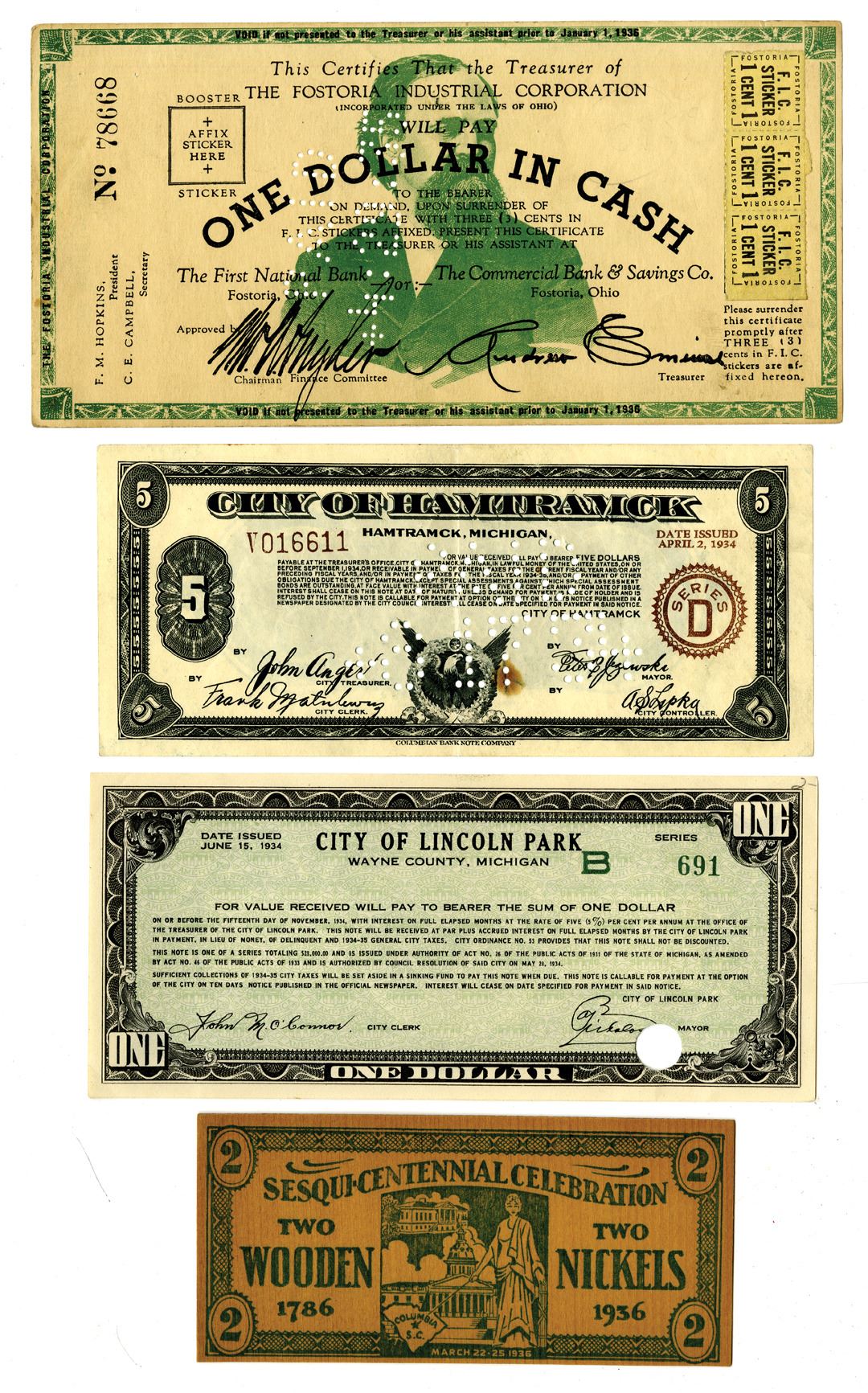 South Carolina, Michigan, & Ohio, 1934-36. Lot of 4 Obsolete Banknotes, Includes: Sesqui-Centennial Celebration, 2 Wooden Nickels, Issued Certificate; City of Lincoln Park, $1, Cancelled Certificate; Fostoria Industrial Corp., $1, Cancelled; City of Hamtramck, $5, Cancelled. Notes are VF-XF condition. (4). Sold "AS IS" no returns accepted.