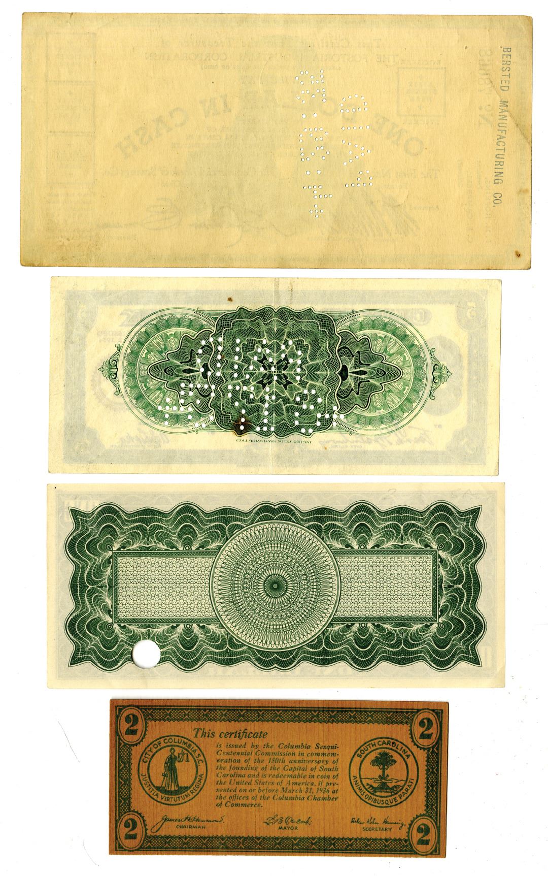 South Carolina, Michigan, & Ohio, 1934-36. Lot of 4 Obsolete Banknotes, Includes: Sesqui-Centennial Celebration, 2 Wooden Nickels, Issued Certificate; City of Lincoln Park, $1, Cancelled Certificate; Fostoria Industrial Corp., $1, Cancelled; City of Hamtramck, $5, Cancelled. Notes are VF-XF condition. (4). Sold "AS IS" no returns accepted.