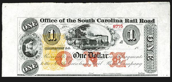 Charleston, S.C. 18xx (ca.1860-70's). $1. Remainder banknote. Black with red underprint. 5 cents yellow I.R. imprint on left. Seated allegorical Indian maiden with train in middle, Large excess margins, Choice to Gem Uncirculated if trimmed. ABNC.