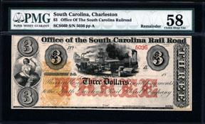 Charleston, S.C. 18xx (ca.1860's). $3. Remainder banknote. Black with red underprint. 5 cents yellow I.R. on left. Train at docks with allegorical seated reaper on left. Graded "58" Choice About Uncirculated in a PMG holder, but it appears to be Unc. to CU. Attractive banknote that has philatelic crossover appeal and is becoming more difficult to find. ABNC.
