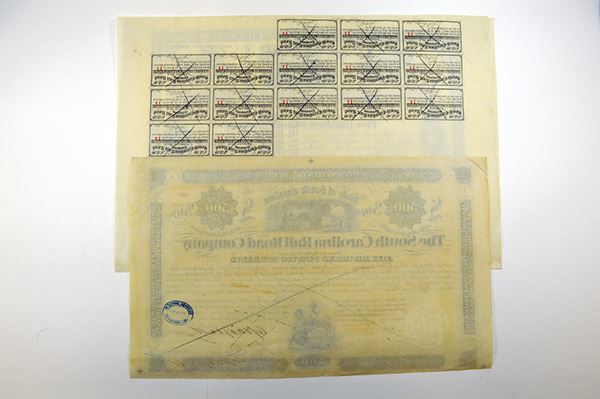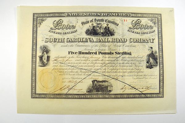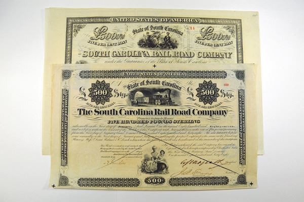 SC. Two different 500 Pounds, 5% Loan Bonds. Issued. Cancelled. 1866 With Coupons, 1868 with no Coupons, Large inked cancellation.