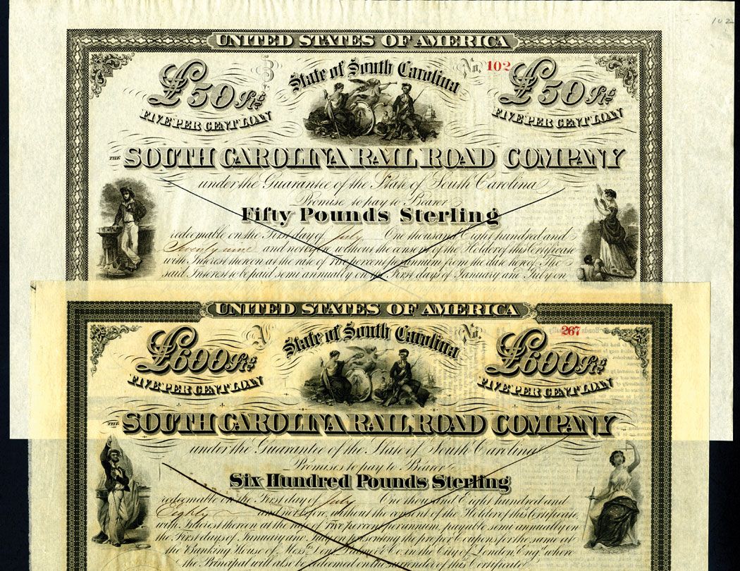 Charleston, South Carolina. Lot of 4 Bonds, All are 5% bonds, Includes £50 Sterling; £300 Sterling; £50 Sterling; £500 Sterling; and £600 Sterling, all are multi-vignetted with locomotives, South Carolina Arms and allegorical figures, All without coupons and ink cancelled. 2 are issued and 2 are unissued. Printed by either ABNC or Van Kleeck & Co., Choice Fine to VF. Attractive southern Railroad bond group.