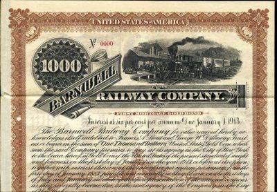 1883. $1,000. Specimen 1st Mortgage 6% Gold Bond. Brown border. Locomotive at station. Red specimen overprints, POC's and "00000" serial numbers. Coupons attached. XF condition. Unlisted railroad in Cox. Rare South Carolina bond. ABNC