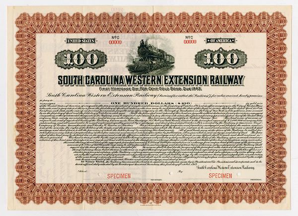 South Carolina. $100 Registered 6% Specimen First Mortgage Gold Bond, Black print on brown border and under tint on horizontal format, Locomotive at top, Specimen overprints and POC's, VF-XF condition, FLBNC.