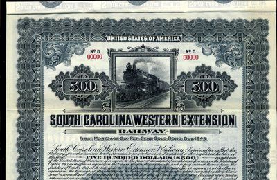 South Carolina. 1913. $500. Specimen 1st Mortgage 6% Gold Bond. Slate blue border. Speeding locomotive. Red specimen overprints, POC's and "00000" serial numbers. XF condition. Unlisted railroad in Cox. FLBNC