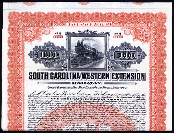 South Carolina, 1913, $1000, 1st Mortgage 6% Gold Bond, Issued Bond, Black on orange border and underprint, Locomotive R-L, Coupons attached, VF-XF condition, ABNC.