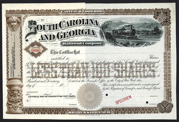 GA. SC. 18xx, Odd Shares, Specimen, Black on brown border, Locomotive over bridge on top right, title on left, Ornate column at far left, Specimen overprints, POC's, XF, ABNC. Listed railroad in Cox, Unlisted with Odd Shares. Scarce and very attractive.
