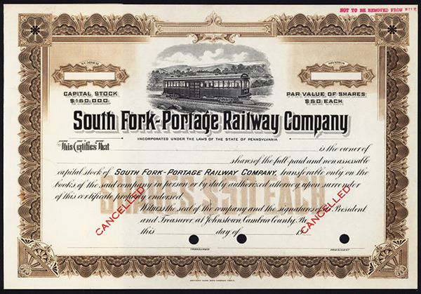 Pennsylvania. Odd Shares Specimen Stock Certificate. Black ink with brown border and under print. Vignette of Inter-urban electric train driving through the countryside. Cancelled overprints, "Not to be removed from file" overprints, and POC's, XF condition, SBNC. Rare and attractive certificate.