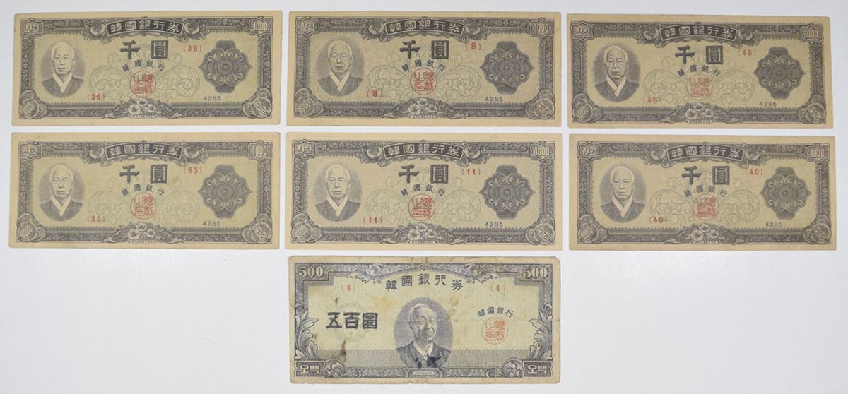 South Korea....., 1952-56. Lot of 7 Issued Banknotes, Includes: 1952, 1000 Won, P-10a (6), Black-green print with portrait of Syngman Rhee at left, Back is brown with pagoda at center; 500 Hwan, P-20, Gray-blue on green underprint with portrait of Syngman Rhee at center. Notes range from Fine to VF+ condition. (7). Sold "AS IS" no returns accepted.